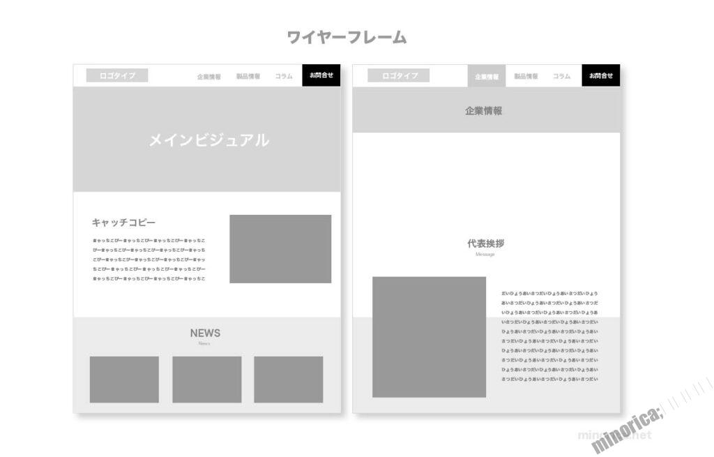 デザインの初期段階で使われ、画面にどのような要素がどこに配置されるかを示すため用いられます。ワイヤーフレームは、要素の配置や情報の流れ、ユーザーの操作性を検討するために使用されます。デザインの細部やビジュアルスタイルは排除した要素のみを示したものです。